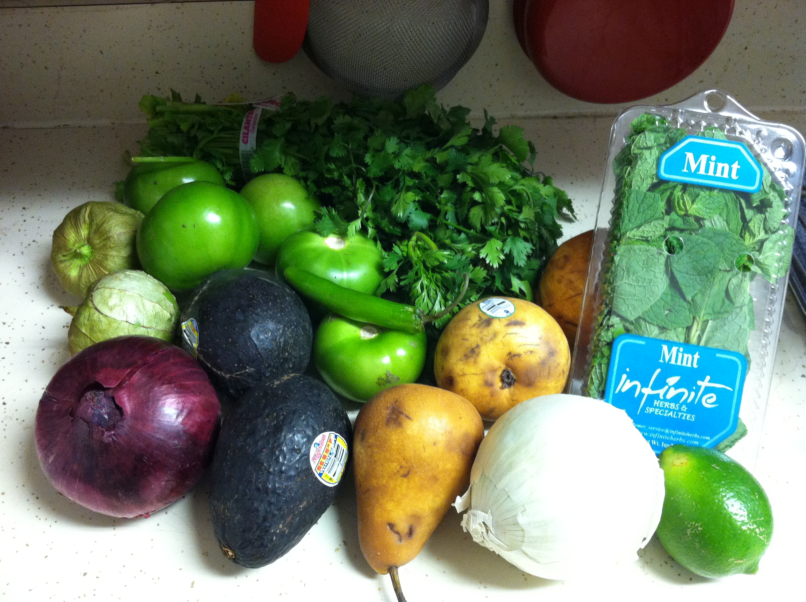 Well, I opted for that tomatillo and pear observance that I mentioned.  I found a Charred Tomatillo Guacamole recipe to try, as well as a Crunchy Pear Salsa.