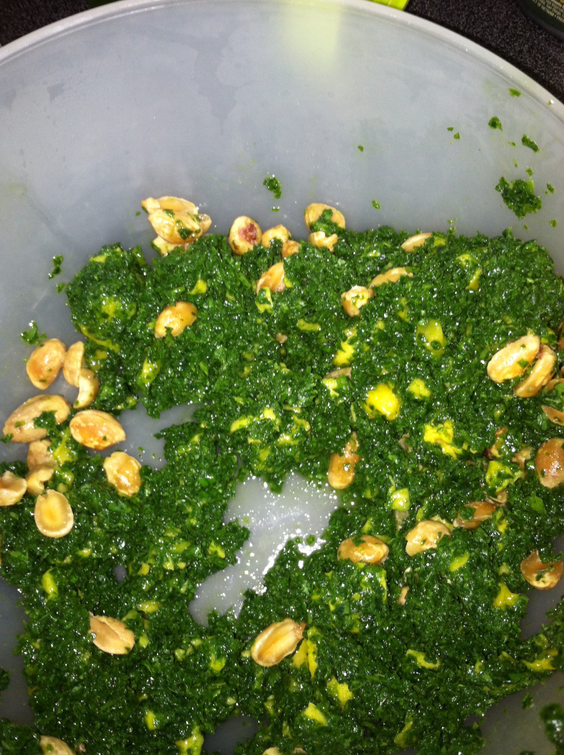 So, I just put the kale (stems removed) in the food processor bit by bit to get it to the texture I like. Then I threw the frozen mango chunk in there and just pulsed a couple times and it got them into smaller, yet still good size pieces. Threw the spices in and perfect. Removed it from the food processor and stirred the peanuts in. Then tossed in some canned tuna. So good, very filling and healthy.