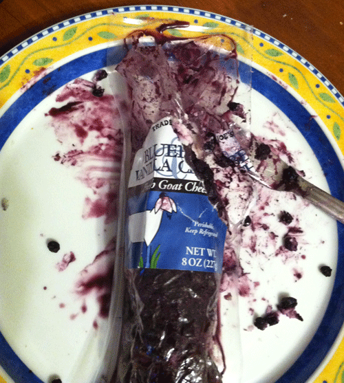 The full, fancy name — Trader Joe’s Goat Cheese – Blueberry Vanilla Chevre.  What’s in it, not a ton — pasteurized goat’s milk, wild blueberry (wild blueberries, grape juice), salt, vanilla extract (vanilla beans, water, bourbon), cheese cultures, vegetable rennet, natamycin (natural yeast and mold inhibitor).