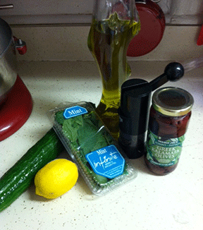 Then combine cucumber, olives, mint, lemon juice, olive oil, and pepper.