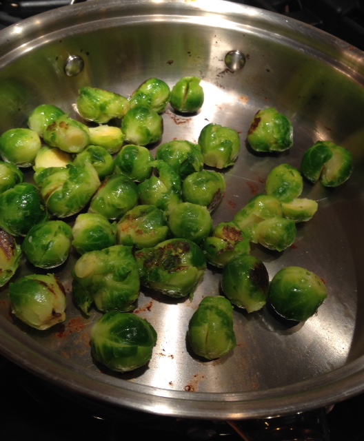 2-In large saute pan over low heat, melt butter into oil (I used a bit of oil and also sprayed the pan). Place Brussels sprouts in the pan, cut side down (that didn’t last too long). Turn the heat to medium-high. Cook until sprouts are brown and caramelized, about 10 minutes. Remove from heat. Transfer sprouts to a large bowl and season with 1/2 tsp of the salt.