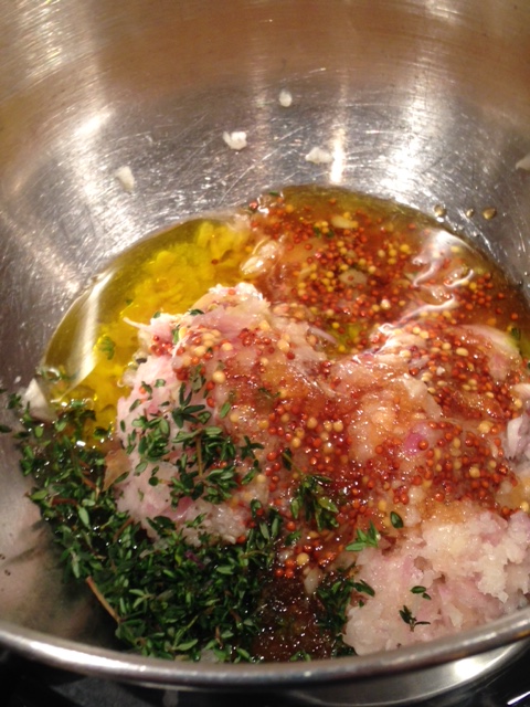 3-In a medium bowl, mix remaining salt, vinegar, shallots, mustard, thyme, honey, and olive oil. Pour into the saute pan and bring to a simmer. Add beans and cook for 1 minute. Remove from heat.