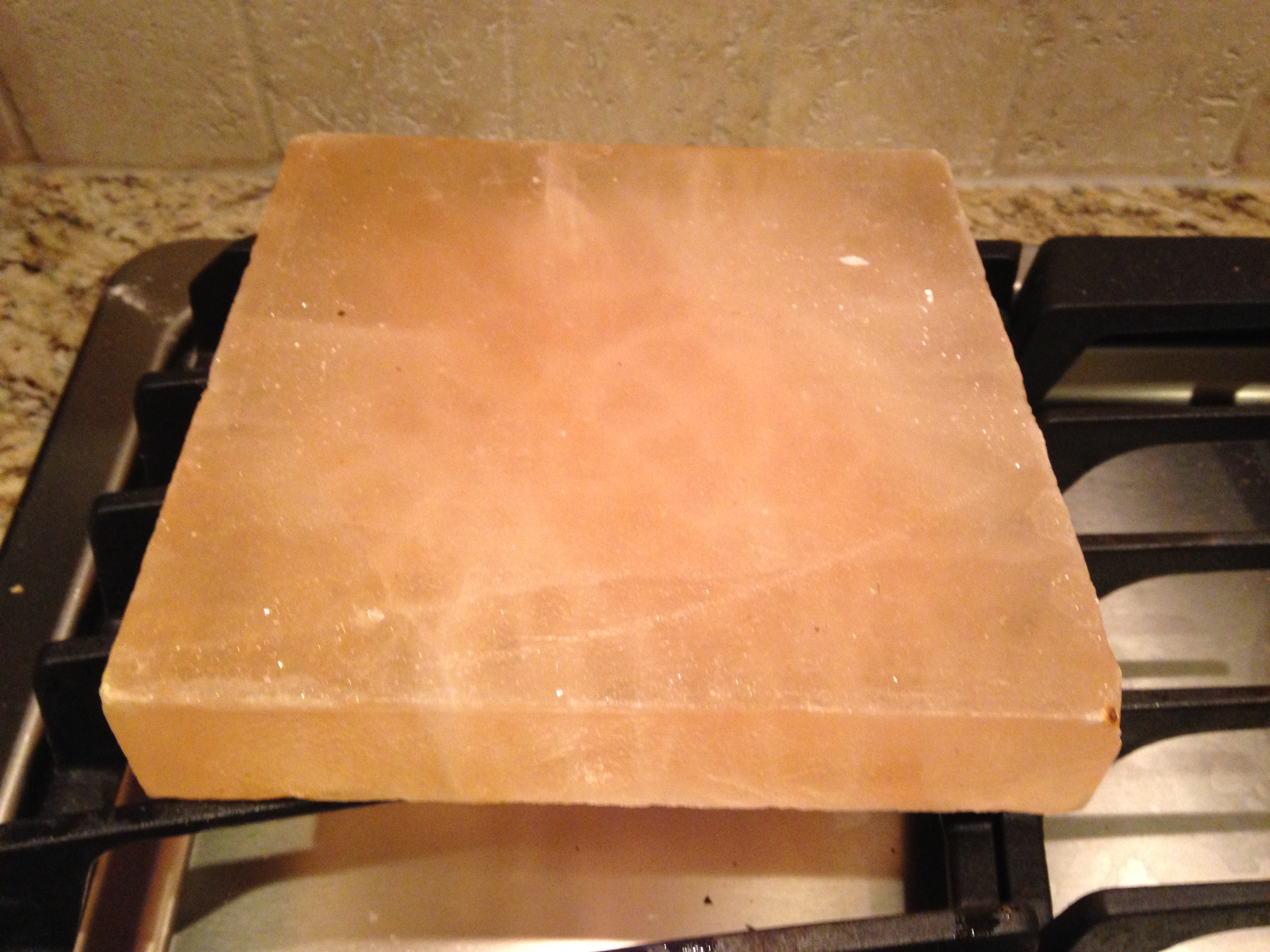 IMG_1733[1] To do that, you heat it up very slowly over the course or 45-60 minutes.  You can do it on a gas or electric stove, with some considerations in mind, based on what the salt block makes contact with, so that it doesn’t crack. Over the course of heating the block, we increased the heat on the (gas) stove incrementally over the course of about 45 minutes, in 10 minute intervals.