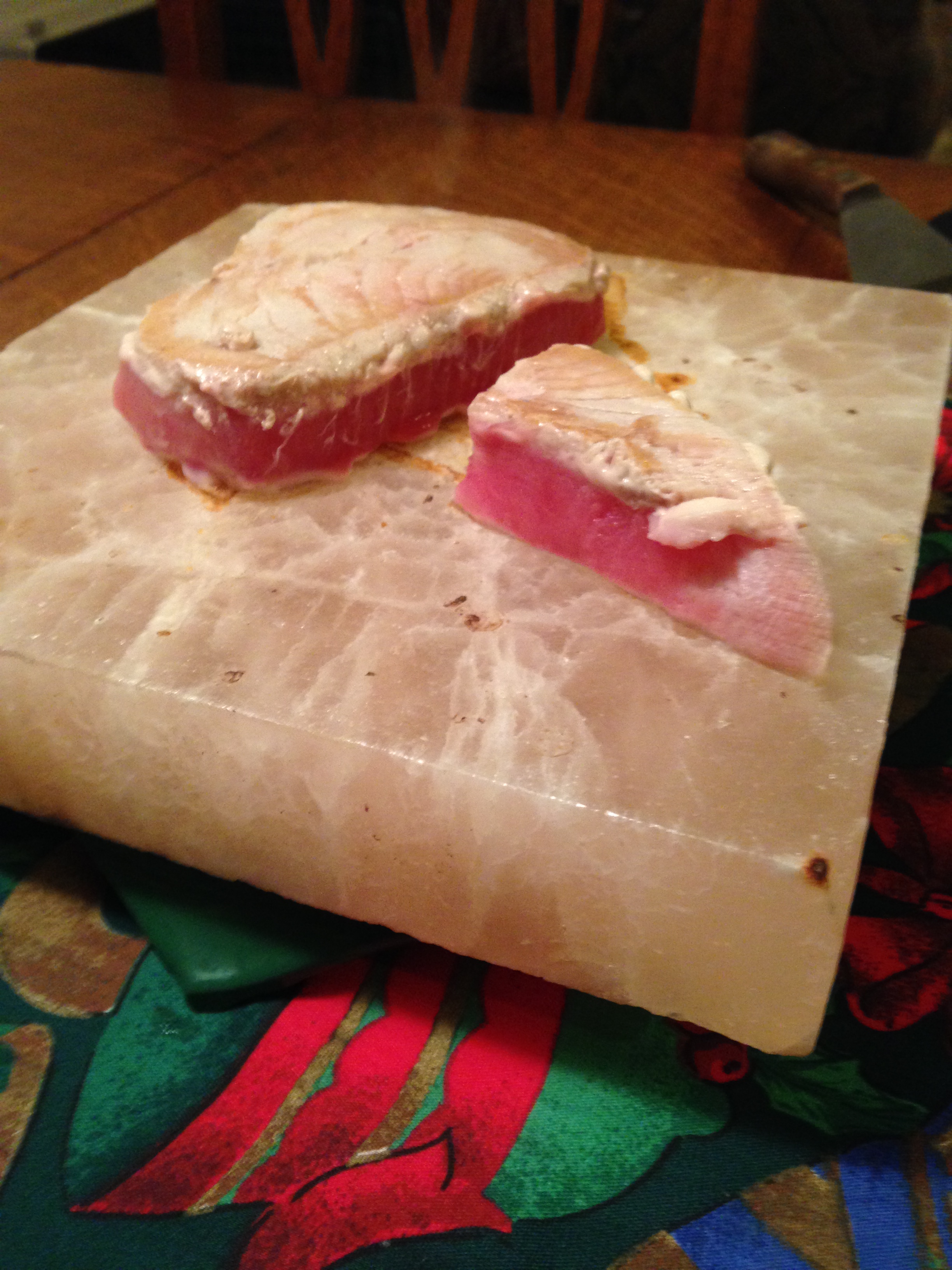 IMG_1732[1]When you put the meat on the block, it picks up just a hint of salt on the exterior and then you get the balance of the meat flavor on the inside.  We decided to cook a nice tuna steak the other night.  When we felt the block was hot enough, we brought it to the table and threw the tuna steak on there.  Of course, after you spend all this time prepping this piece of salt, it takes zero time to cook the meat.  But, that’s why we love cooking — the prep!  Took less than a minute or two to get the tuna to where we wanted.  Even cooked a bit more than (I) wanted, but it was fun to watch.