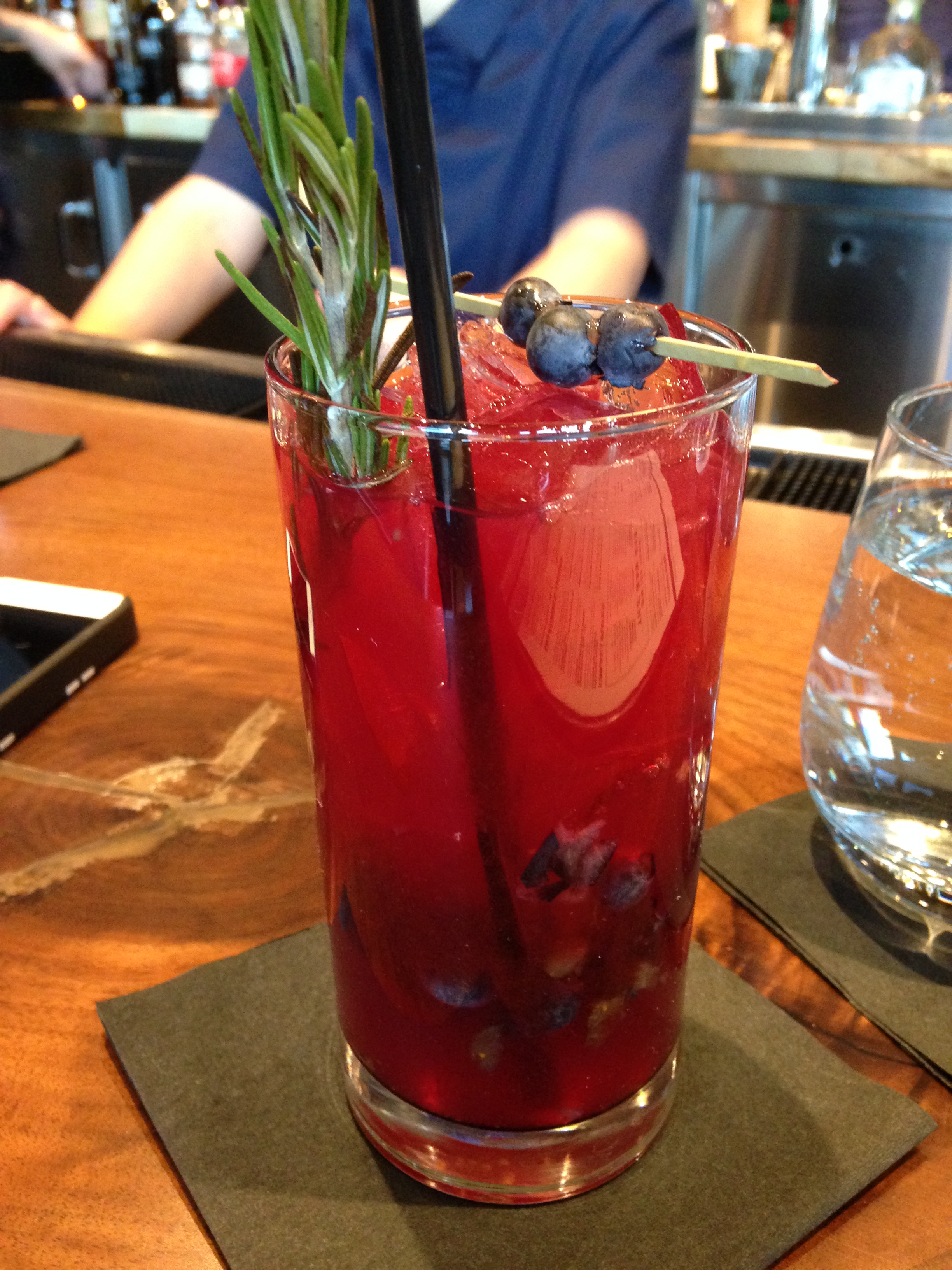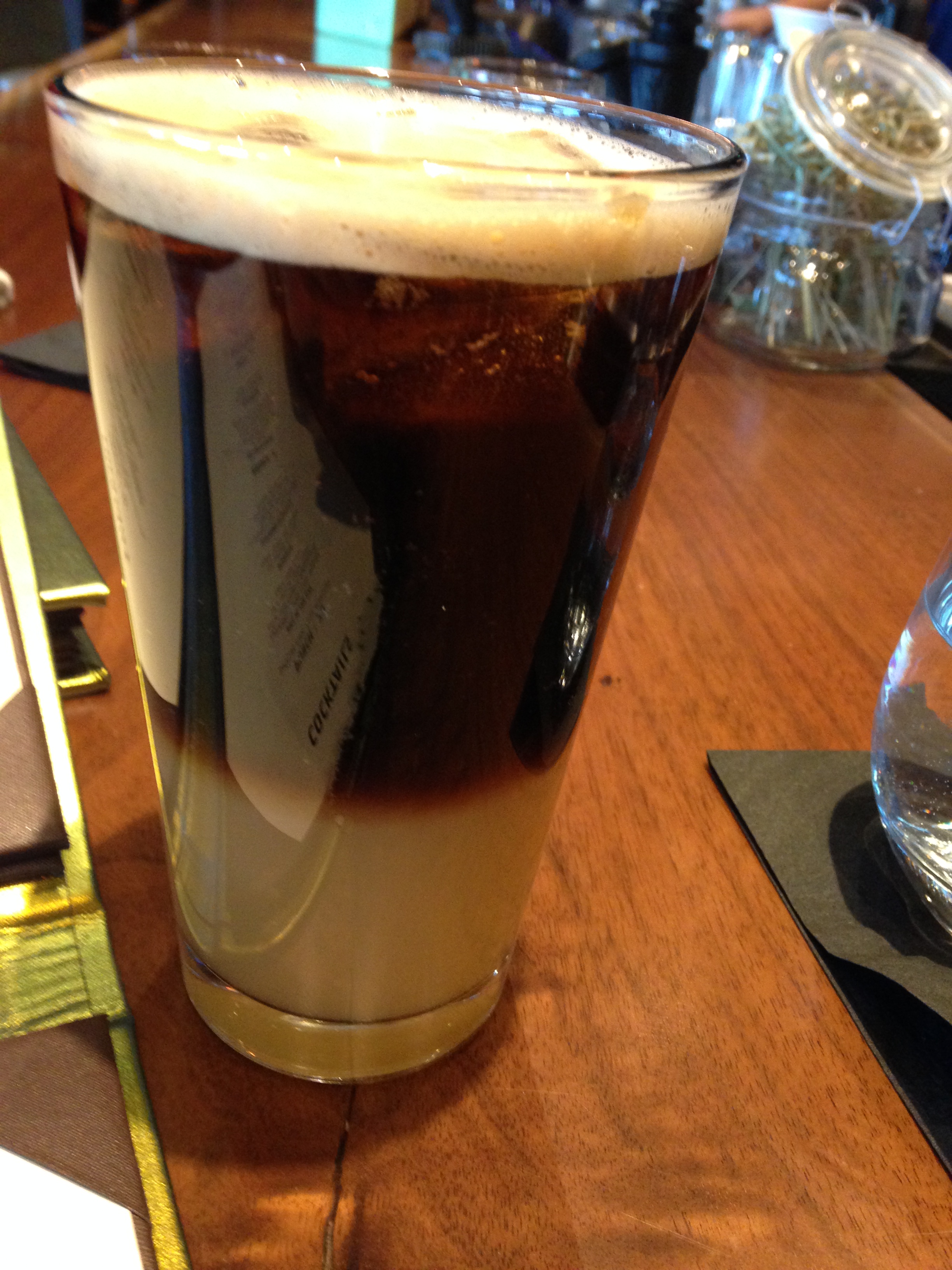 Some of the others at the table were Dark + Stoutly — Stonewall American Rum, Ginger, Flying Dog ‘Pearl Necklace’ Stout. It was very similar to a black & tan. One of them enjoying it stirred it to see if it would combine but it separated again.