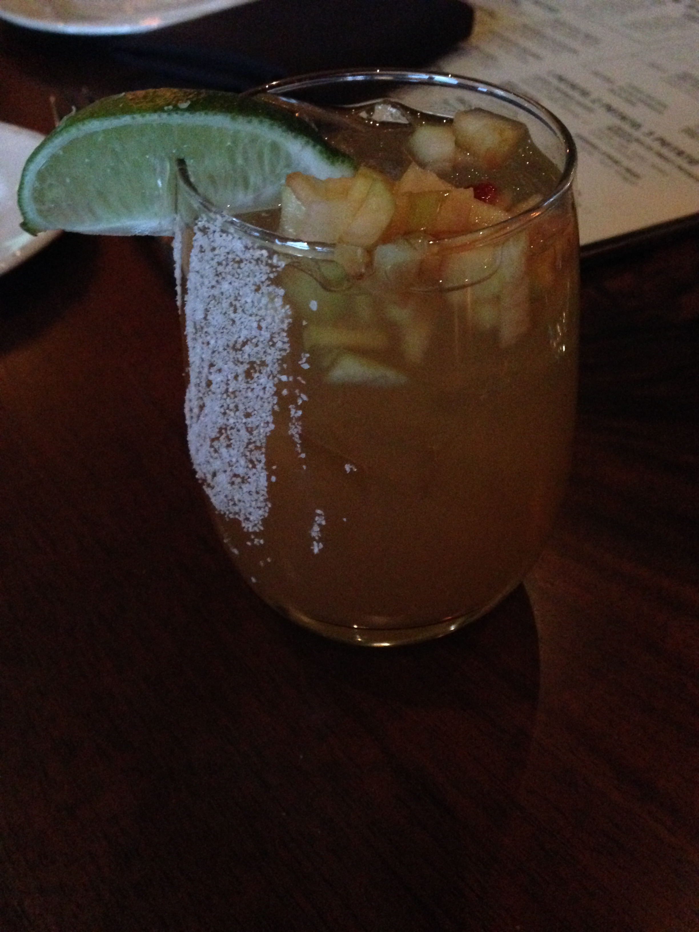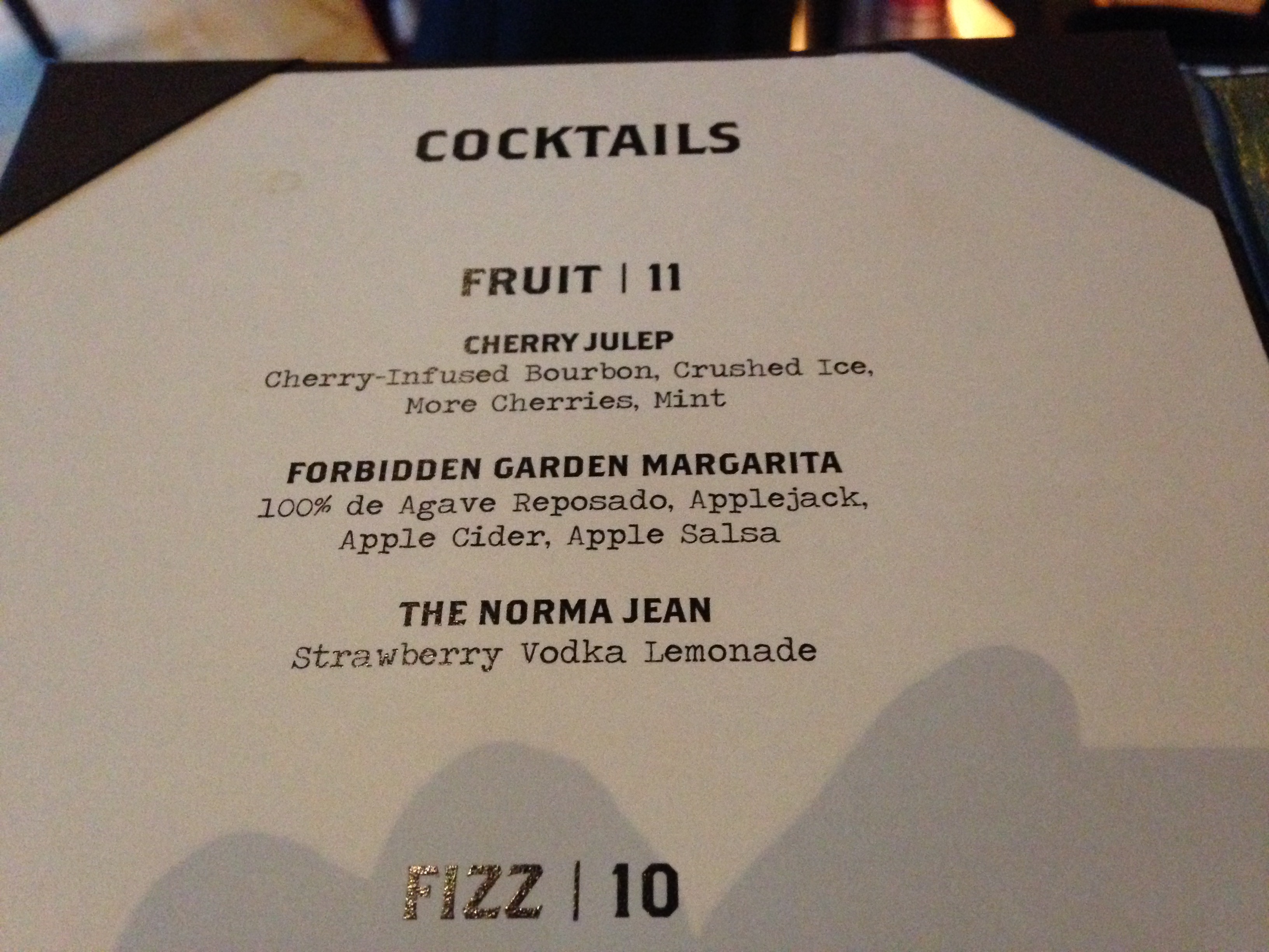 Another at the bar was the Forbidden Garden Margarita — 100% Garden Margarita — 100% de Agave Reposado Applejack, Apple Cider, Applejack. I tried some of that — very nice. Was there really alcohol in that? That is what can cause some problems.