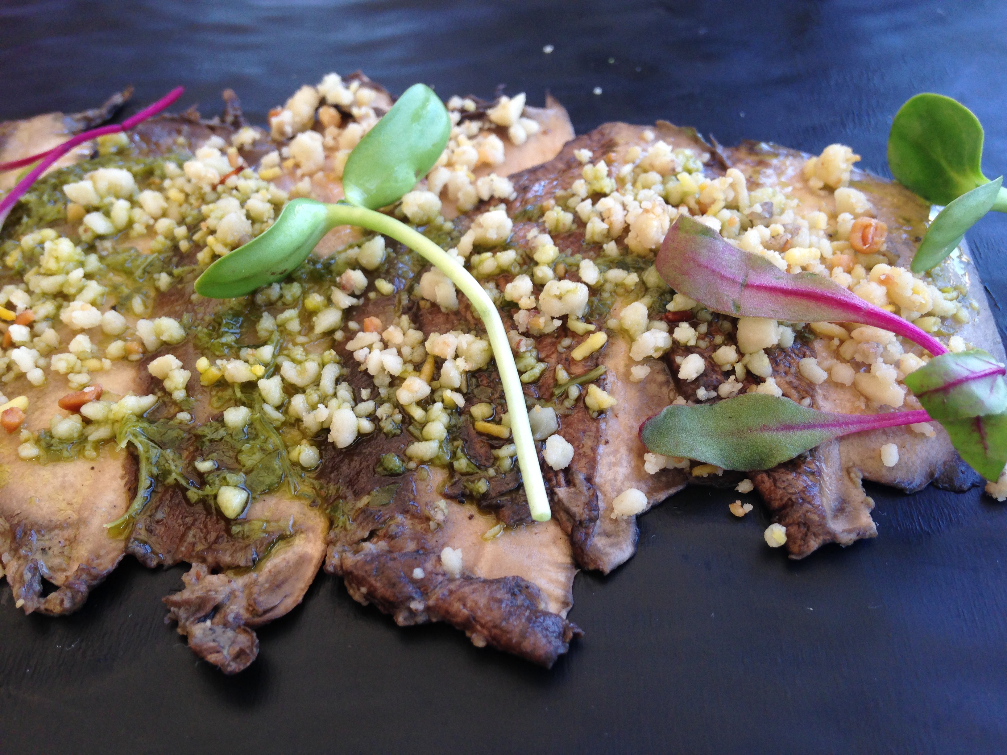 IMG_3572Next up was probably one of THE most amazing dishes I have eaten for awhile.  Portabellos with carpaccio, white miso, chimichurri and pine nuts (though we opted for no carpaccio).  Those mushrooms were so thinly sliced, the flavors melded together in some fashion that was and still is inexplicable.  Wow.
