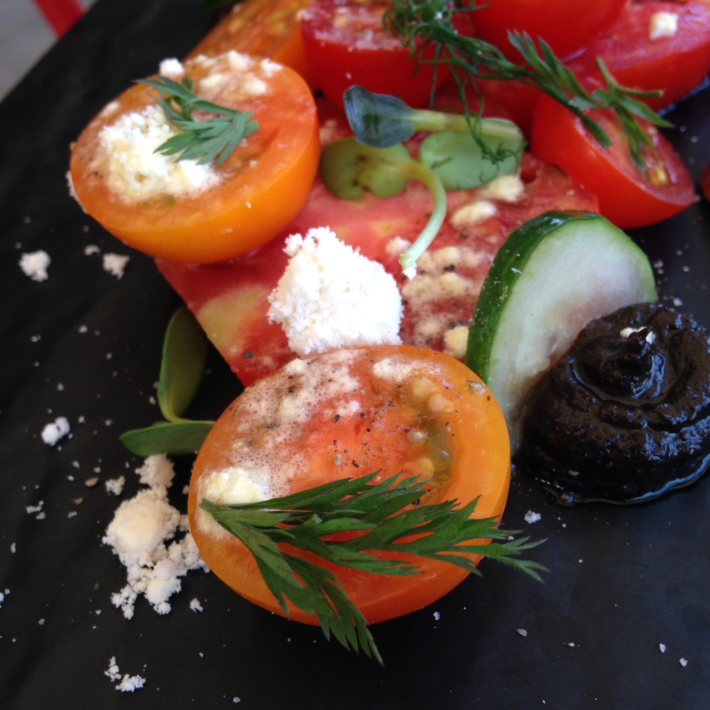 IMG_3585More veggie time now…enjoyed some delicious heirloom tomatoes with cucumbers, olive oil, black garlic, sea salt.  The black garlic was very cool.  Had a different taste and we honestly couldn’t identify it at first!