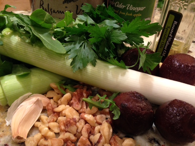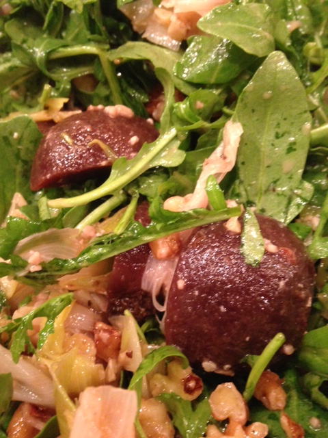 Was having some food-loving friends over so had to do some recipe digging since everybody was making a big contribution. I’d heard some great things about Yotam Ottalenghi and had flipped through a couple of his cookbooks. I remembered this one, Beet, Leek and Walnut Salad from his Jerusalem cookbook. I did have to google the recipe because I’d seen it when looking through the book at a friend’s place and wasn’t able to borrow it before making dinner. So, this might not completely match his.
