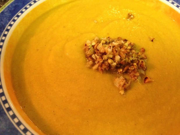 End result, very tasty, orange-ish (not white) soup — totally check out their link for comparison.  Was nice and thick, just like they called for.  Very unique flavor and definitely worth making!