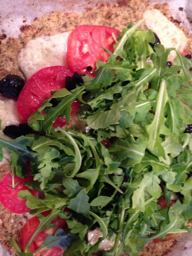I put manchego, olives and tomatoes on the pizza, then topped it with arugula when it came out of the oven.  It was a bit moist, but nice and crisp on the edges.  Very tasty and I’ll have to try it again.