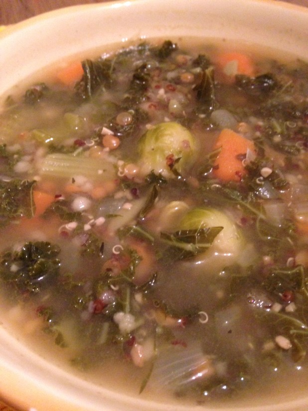Cold, ugly weather. Football, football, hockey. One must have soup to feed! I have a recipe a friend gave me years ago that sounded too perfect for this type of occasion — Lemony Lentil Soup w/ Greens from Ellie Krieger. I added some stuff to it, too. I just remember this soup made a GINORMOUS amount — good word right? I was going to make half, wasn’t paying attention on one ingredient, so had to make the whole thing. And then played around because I knew I was missing some pieces of the puzzle but had good makeups.
