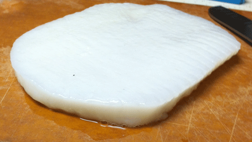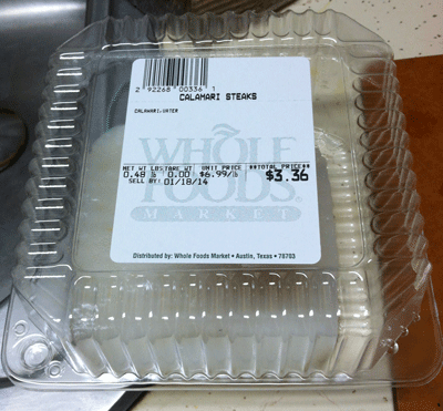 Was roaming around Whole Foods the other night looking for something to make for dinner and came across something I hadn’t seen before — Calamari Steak.  I’ve had rings and thin calamari tubes, but this stuff was amazing. About 1/2″ thick and 1/2lb per steak. Had to give it a try.
