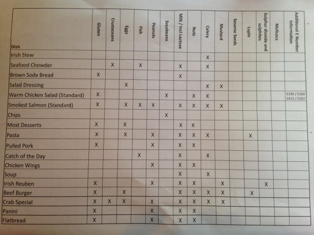 When visiting Ireland, it was amazing to see how attentive they were to people’s food allergies, intolerances, or anything else. This is one menu I really noticed. Others would have labels and legends for what each item on the menu contained (dairy, gluten, soy, nuts, etc). And if somebody wasn’t sure, they would immediately go to the kitchen to find out. They would go out of their way to make the dish work for you and if they couldn’t, they’d suggest the best alternative. Why can’t all our places be so good?