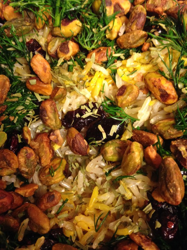 I was introduced to Yotam Ottolenghi‘s cookbooks a few months ago and finally have one of my own — Jerusalem. The recipes and pictures are mouth-watering just when reading them. I made Christmas Eve dinner for some friends and had to break the cookbook out. One of the recipes I tried was Saffron rice with barberries, pistachio and mixed herbs.