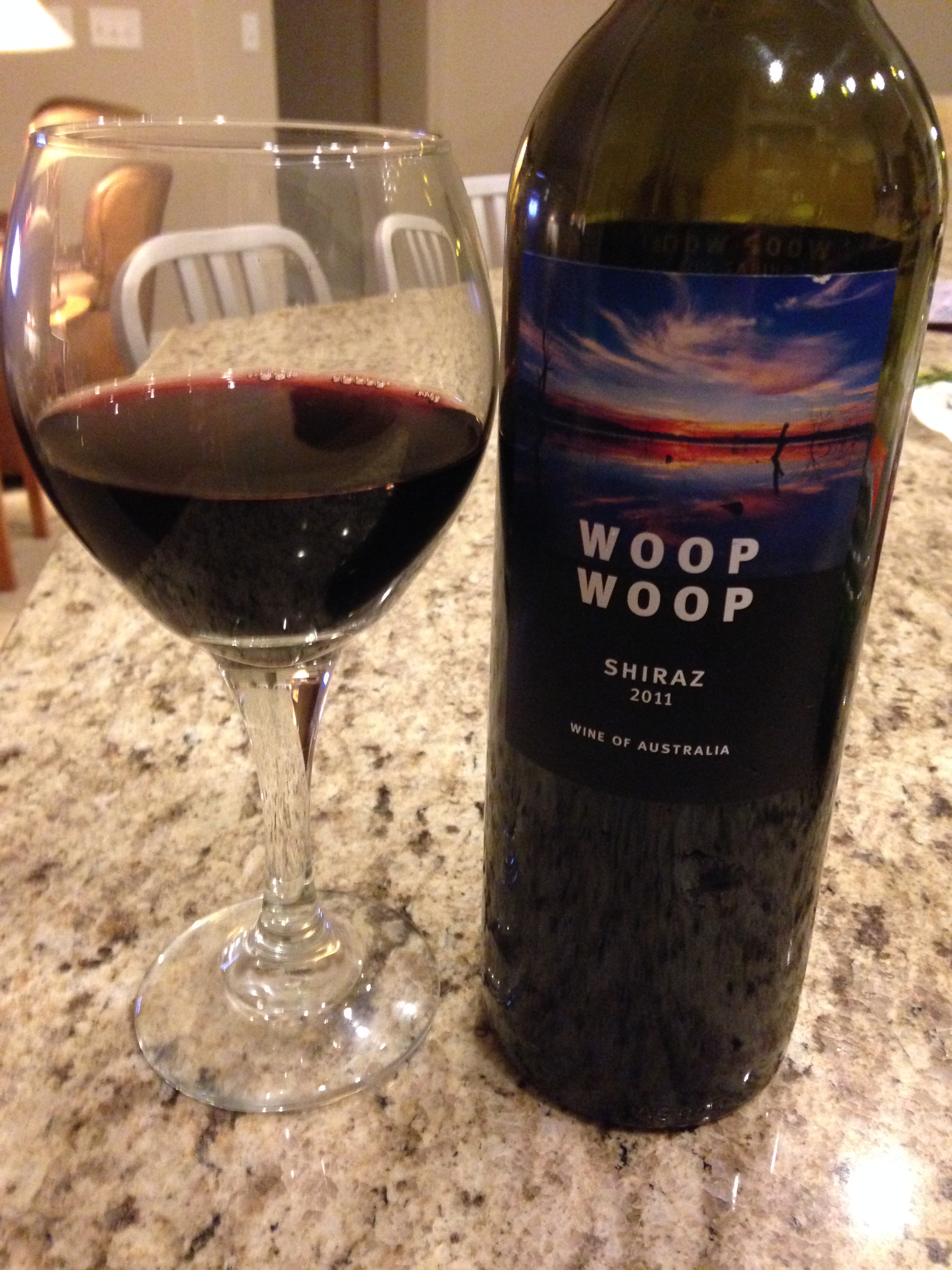 Sounds like I’m cheering, right? Well, I guess I sort of am. Found a great new (to me) wine last night. Was having leftover ‘roo burgers so decided to pick up an Australian wine to pair with them (had beer the first time around). Wanted to get something I hadn’t tried before. Found the Woop Woop Shiraz at the store.