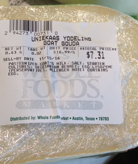 goudaI saw this the other day when I was at Whole Foods and picked some up.  It’s great because it’s harder than the normal goat cheese and as the sign mentions, has a bit of a nutty flavor.  Also, I’ve not purchase that much cheese there and didn’t realize they cut you as big or small of piece(s) as you want to take home.  I got a nice small piece to take with me.